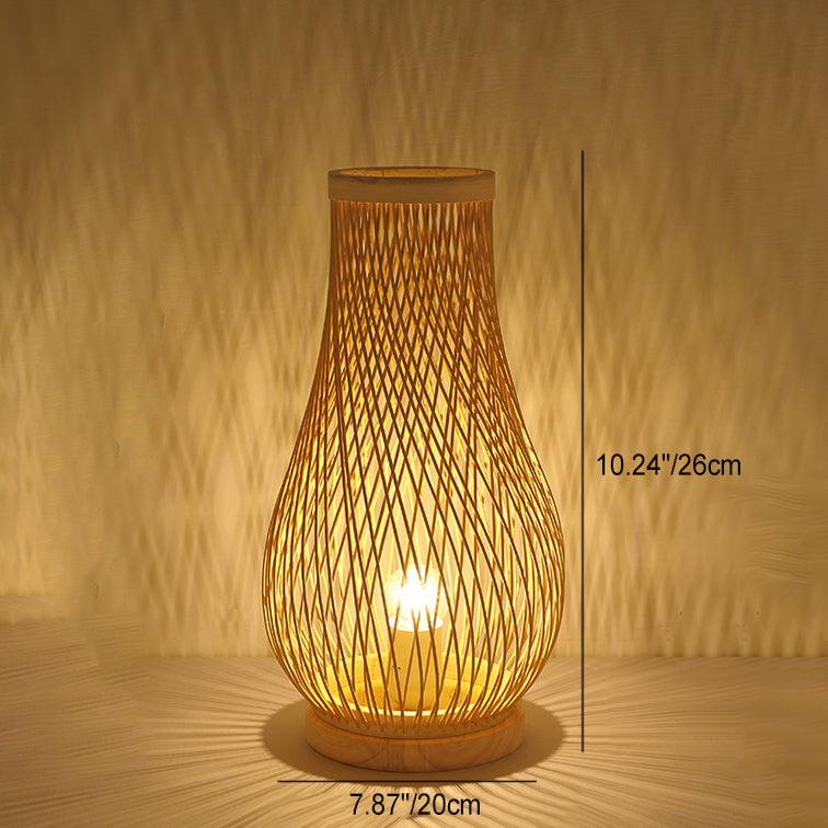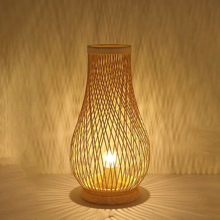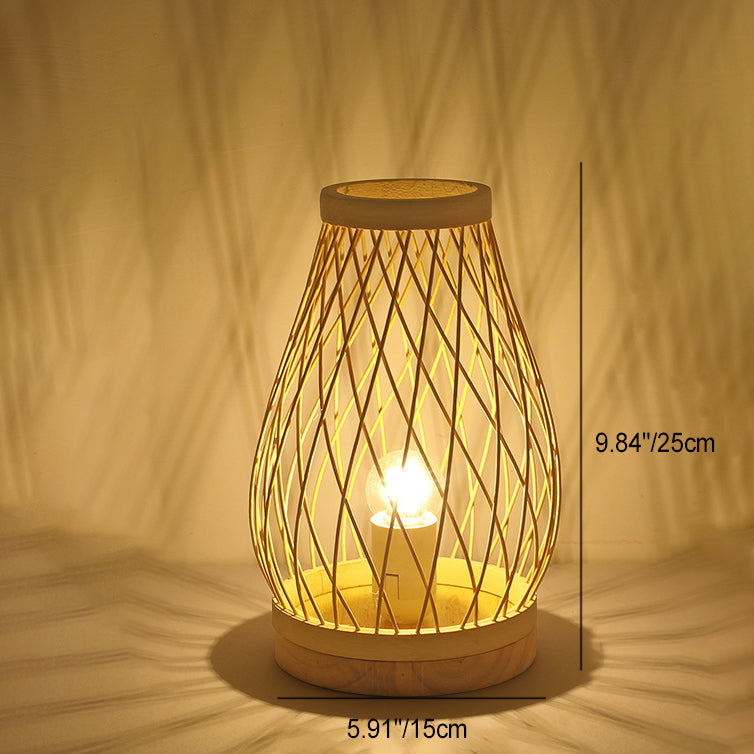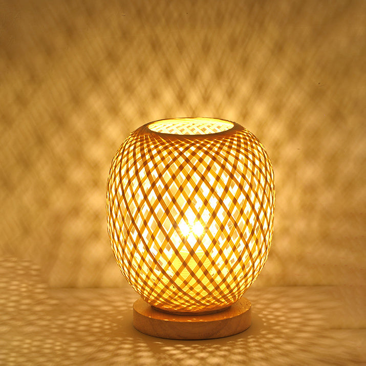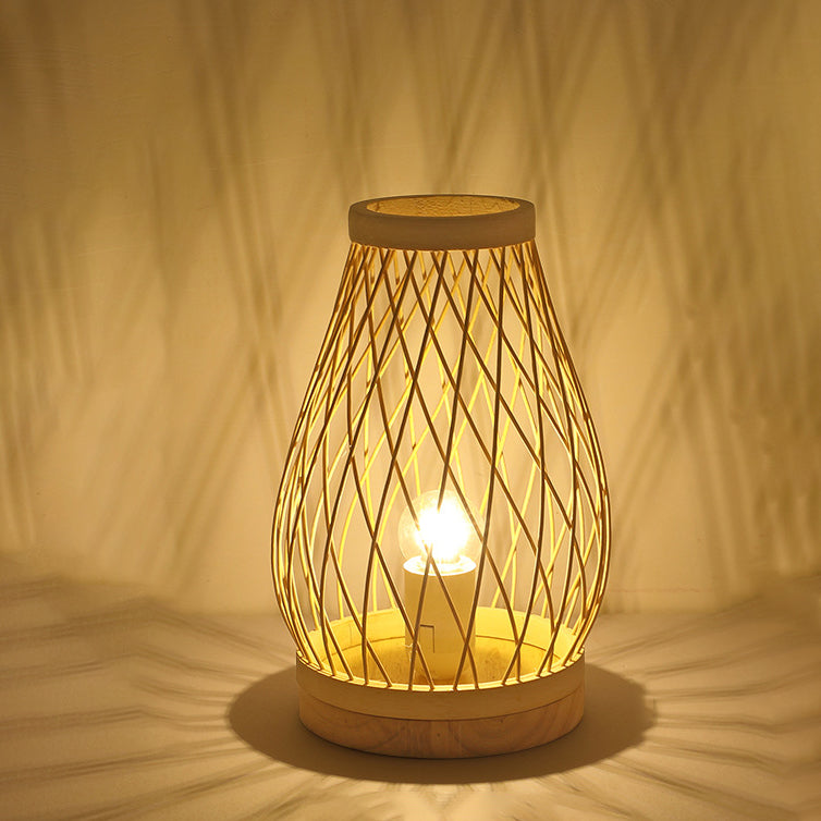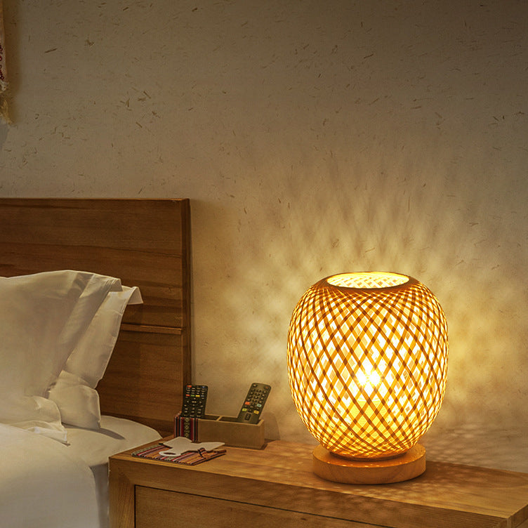 Lampe De Table Contemporaine En Forme De Lanterne En Bois Et Bambou Tissé À 1 Lumière Pour Chambre À Coucher